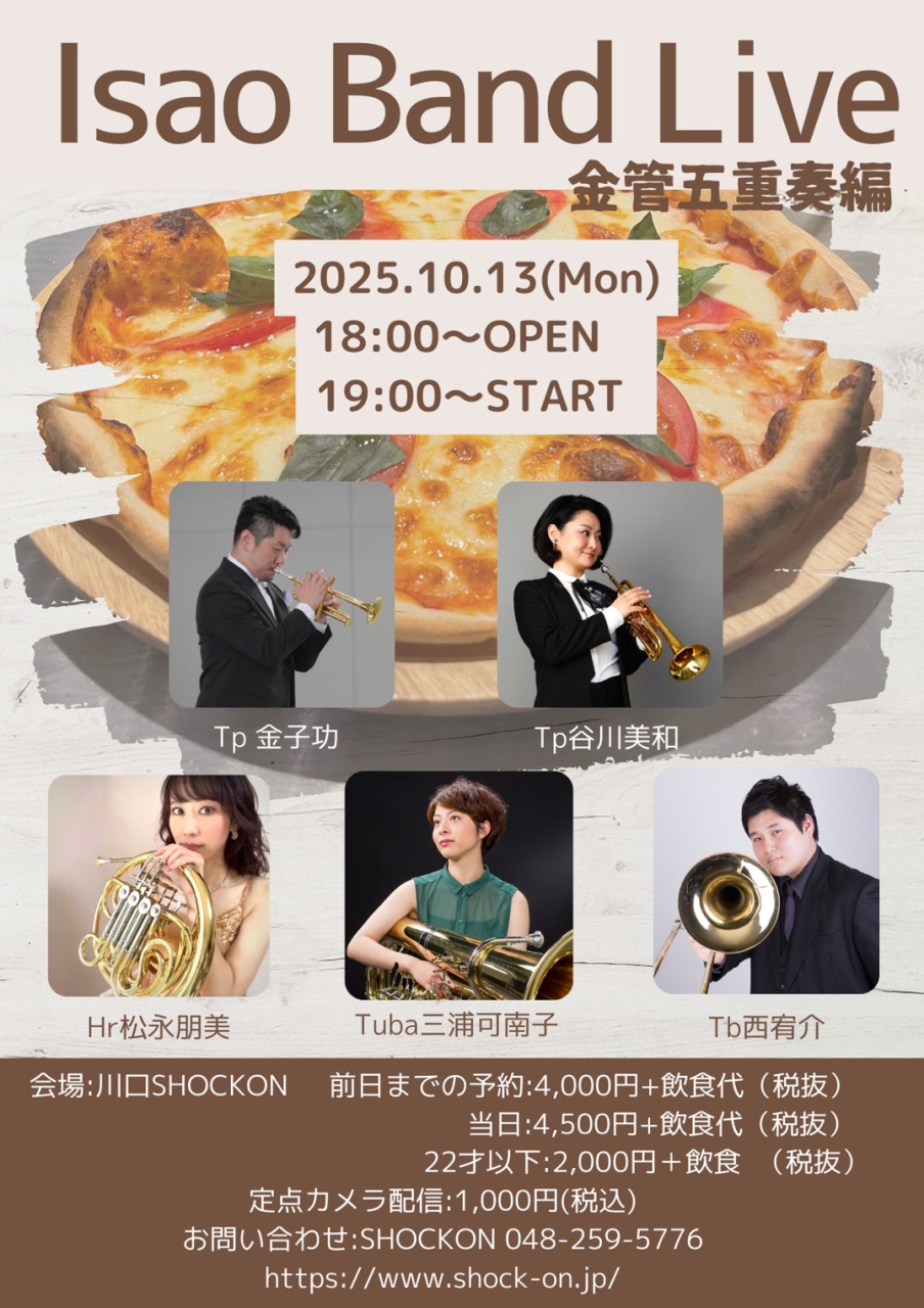 「Isao Band 金管五重奏編」※ツイキャスプレミア配信有り※ 当日¥4,500(税込¥4,950)予約¥4,000(税込¥4,400) |