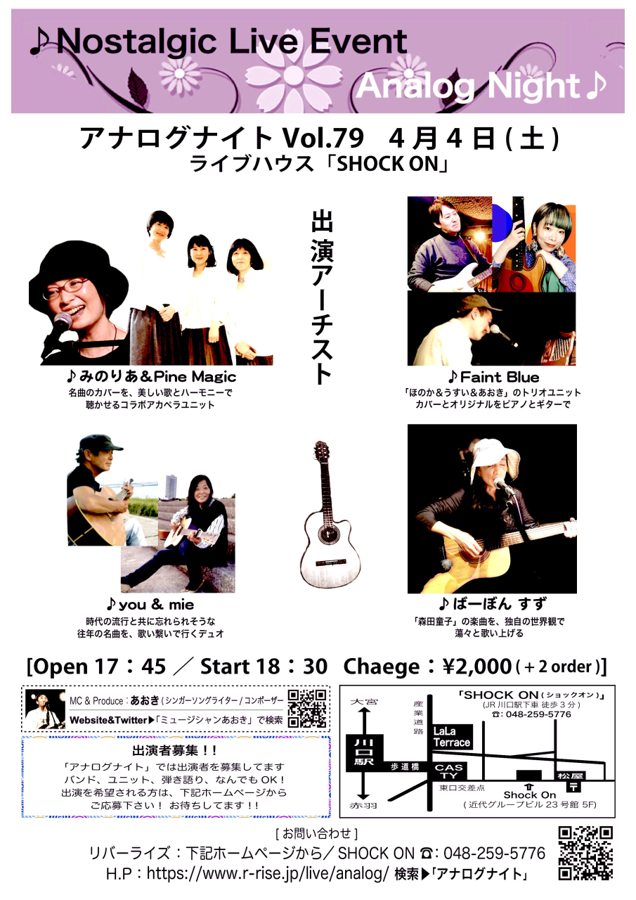 「清水仁 (exオフコース). 黒岩典英 ~ Acoustic DUO Live ~」 予約¥3,500(税込¥3,850)当日¥4,000(税込¥4,400) |