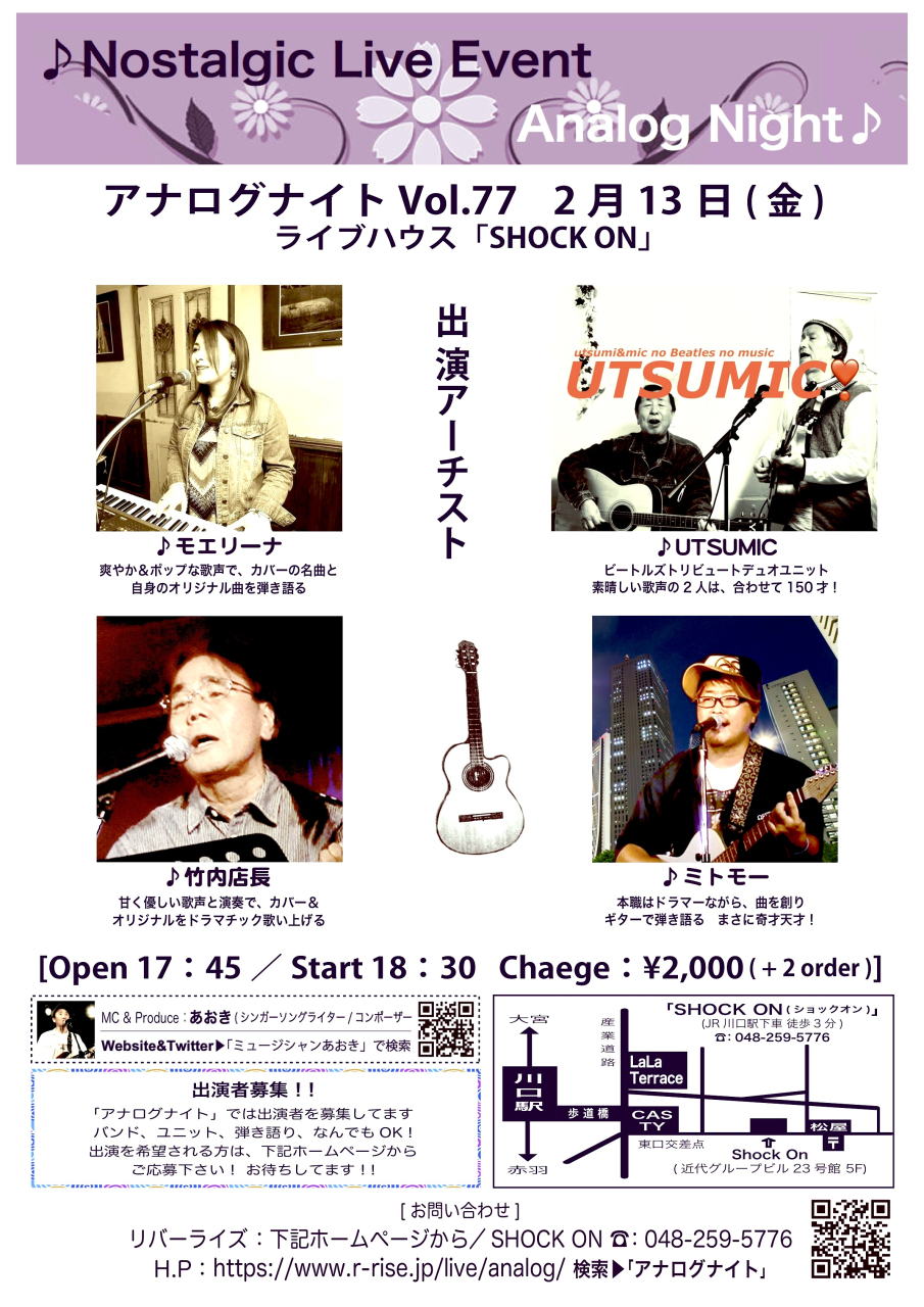 【※12月10日21時よりメール予約受付開始】【ゲネプロ】「晃バレンタイン・ライブ」 Charge¥3,000(税込) 【※12月10日22時よりメール予約受付開始】【本番公演】「晃バレンタイン・ライブ」 Charge¥7,000(税込) |
