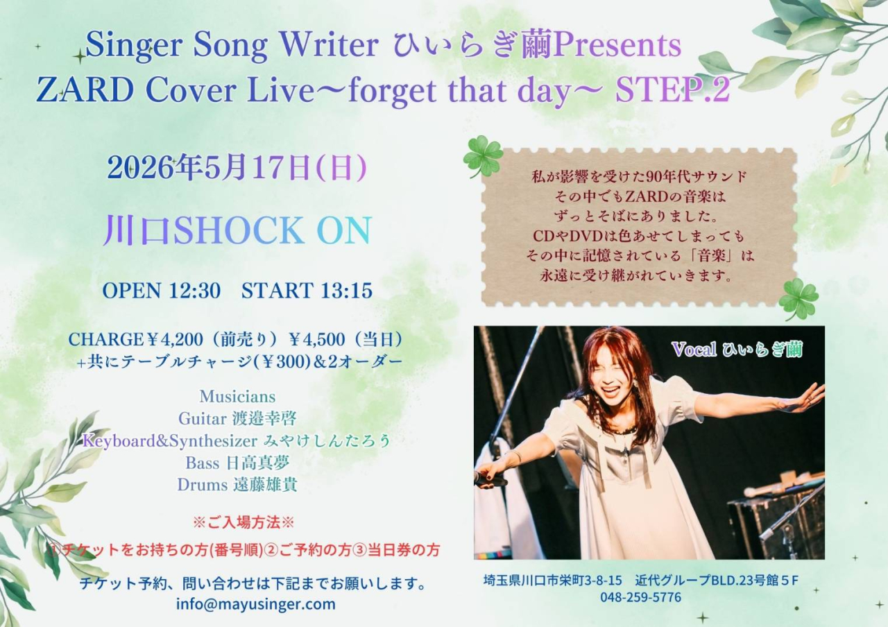 「Singer Song Writer ひいらぎ繭Presents ZARD Cover Live~forgetthat day~ STEP.2 前売り¥4,200(税込)当日¥4,500(税込) |