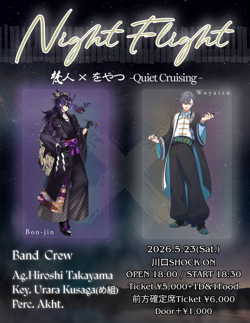 【※SOLD OUT※】「Night Flight 梵人×をやつ -Quiet Cruising-」※TIGETよりご購入をお願い致します※ 前方席¥6000(税込) 自由席¥5000(税込) |