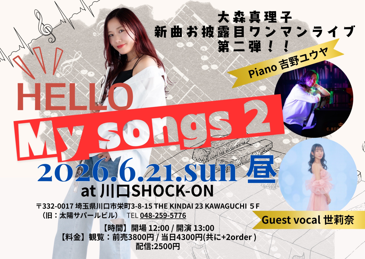 「大森真理子新曲お披露目ワンマンライブ 第二弾!! Hello!My Songs Ⅱ」 前売3800円 / 当日4300円 |
